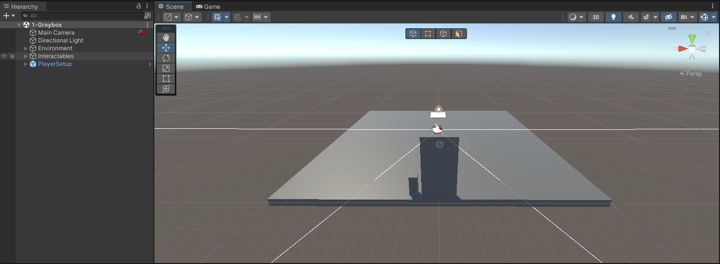 La planificación está completa. Ahora puedes comenzar a trabajar en Unity. Comenzarás a trabajar en una caja gris de tu prototipo, donde se usan formas primitivas en 3D (que a menudo son de color gris) para bloquear la Scene (Escena) y poder implementar las funciones básicas.