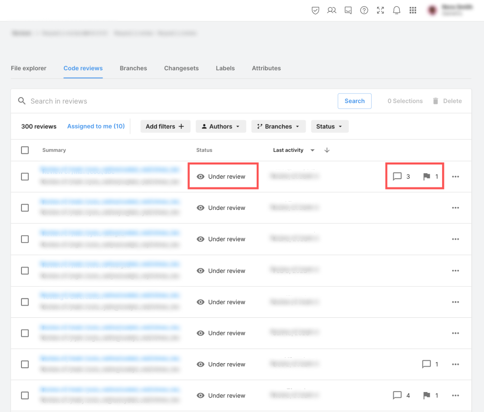 - The code review on the first line in the screenshot shows Under Review, which means a review is currently in progress. Code reviews remain Under Review until you or other reviewers approve them or ask for changes to be made to them.
