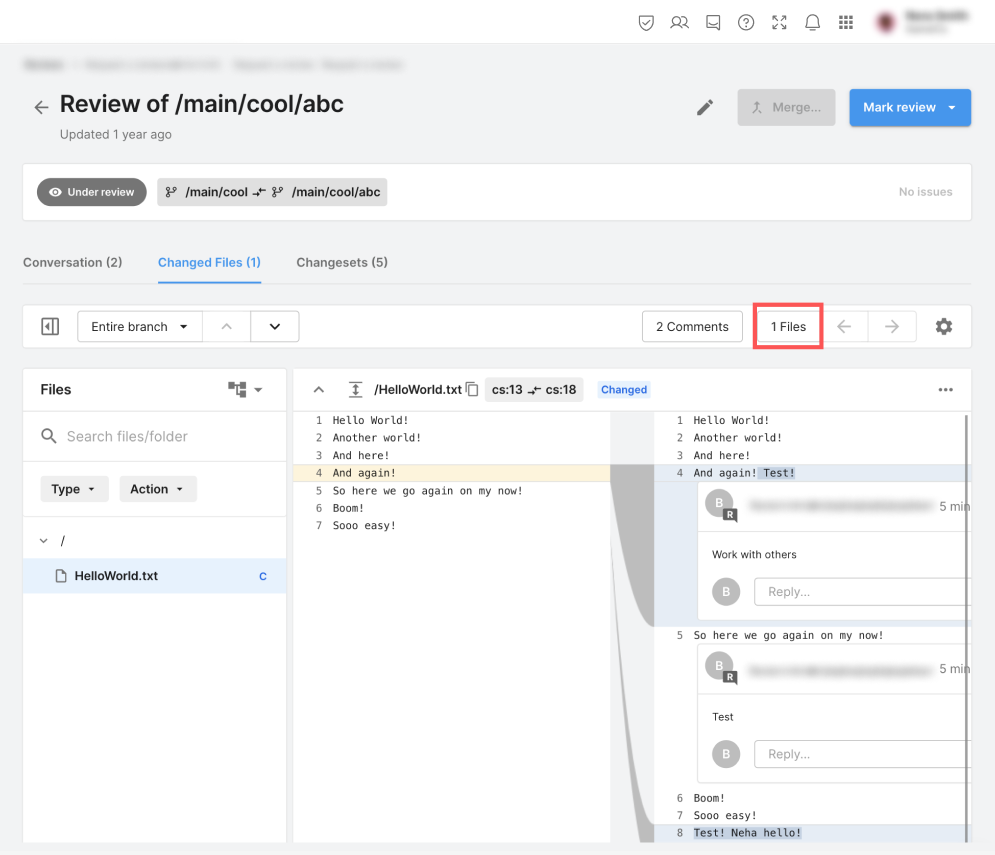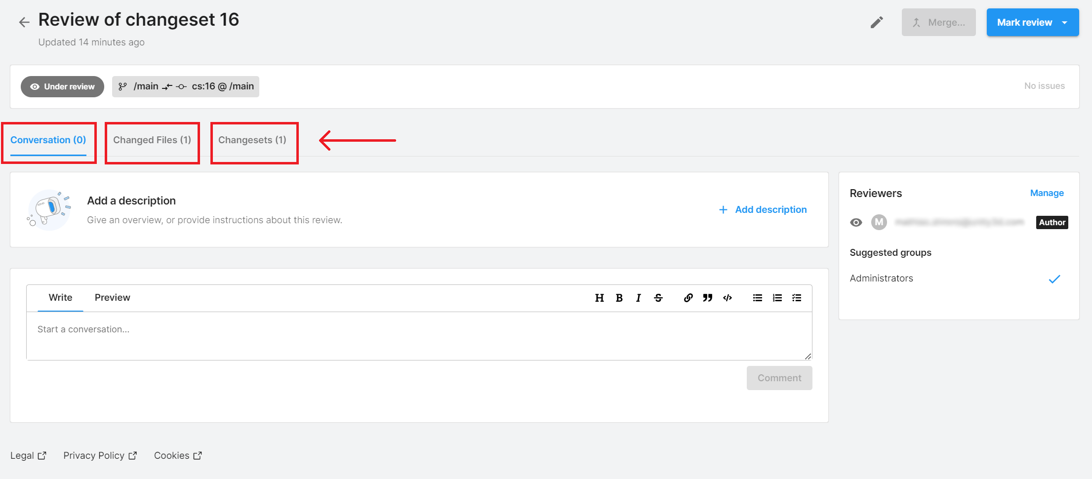 You should now see a more detailed view with three tabs: Conversation (comments), Changed Files (modified files during the review), and Changesets (all the different changesets that are part of this review). You’ll learn about what each tab does in the next step of this tutorial.