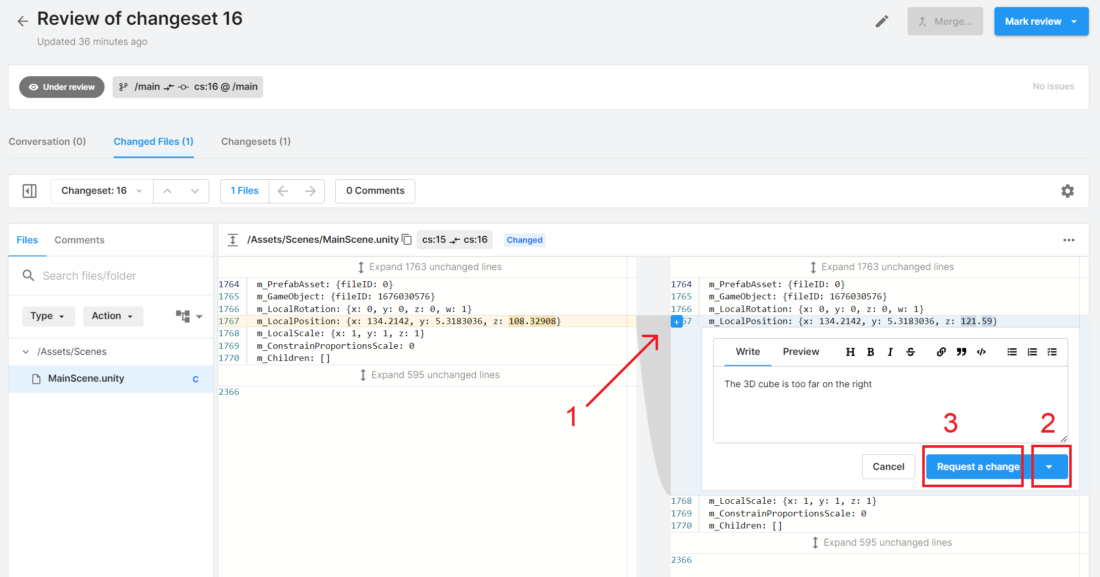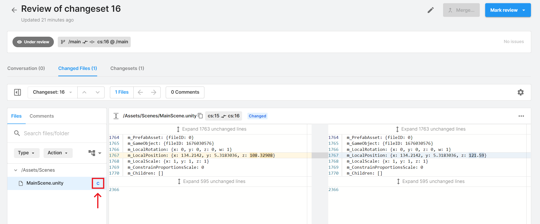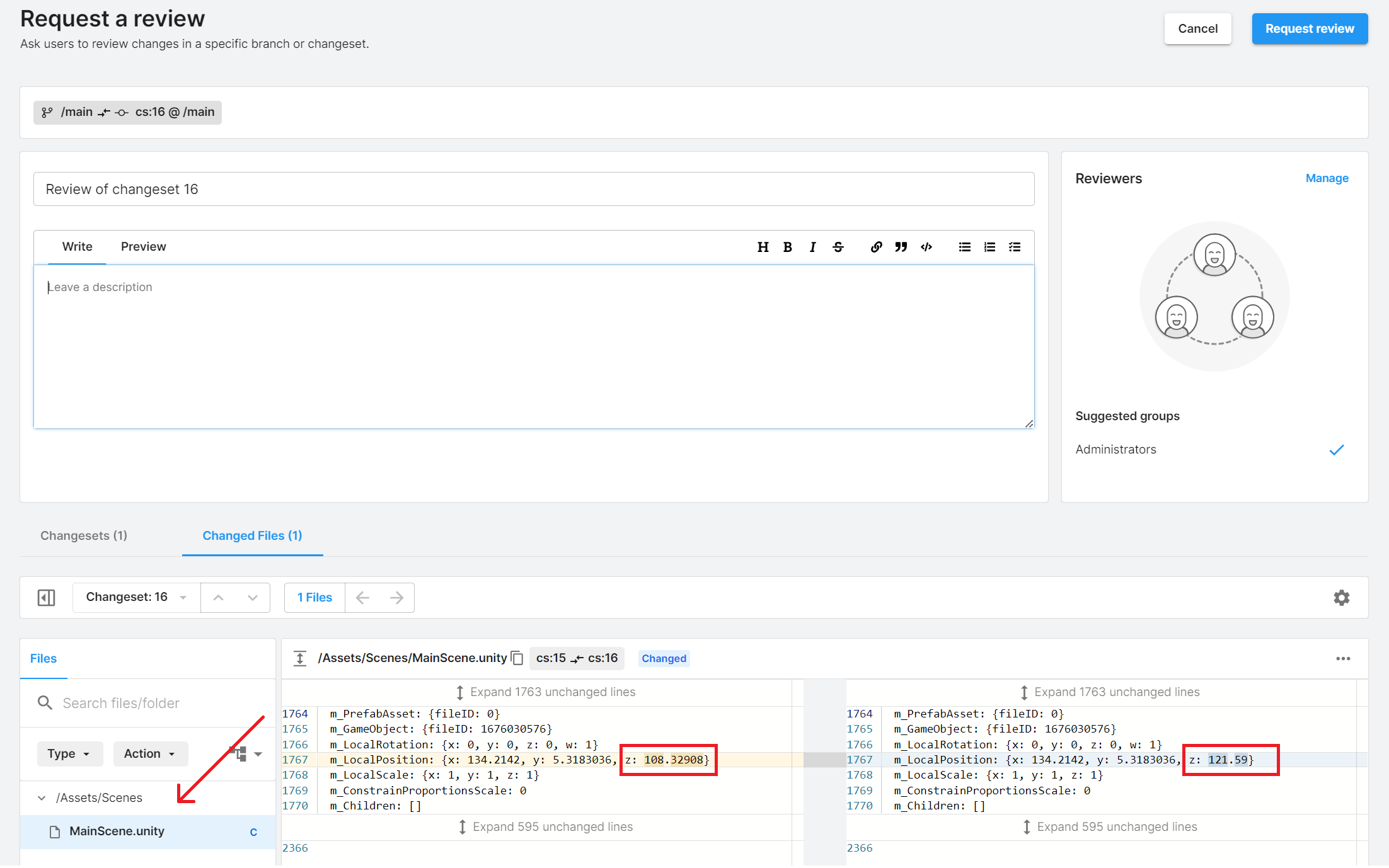 4. Scroll down in the Request a review window and make sure that the Scene.unity file is selected. Look at the code displayed on the table in the center of the screen.