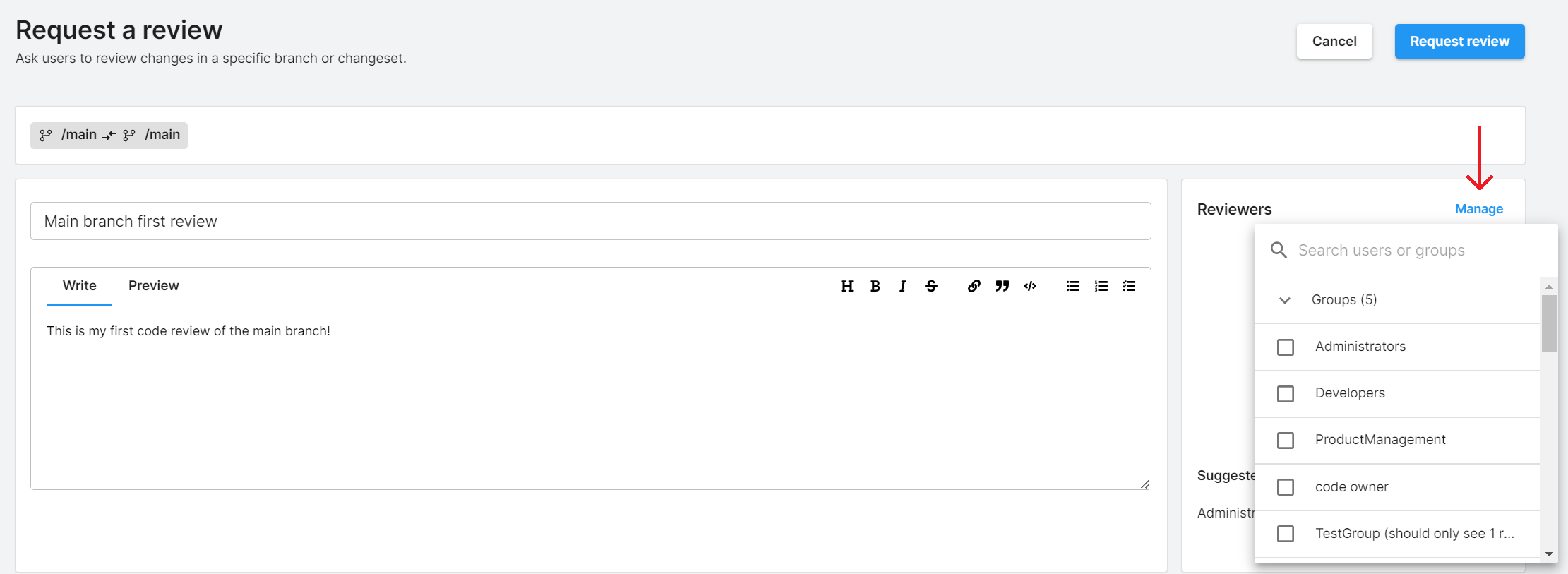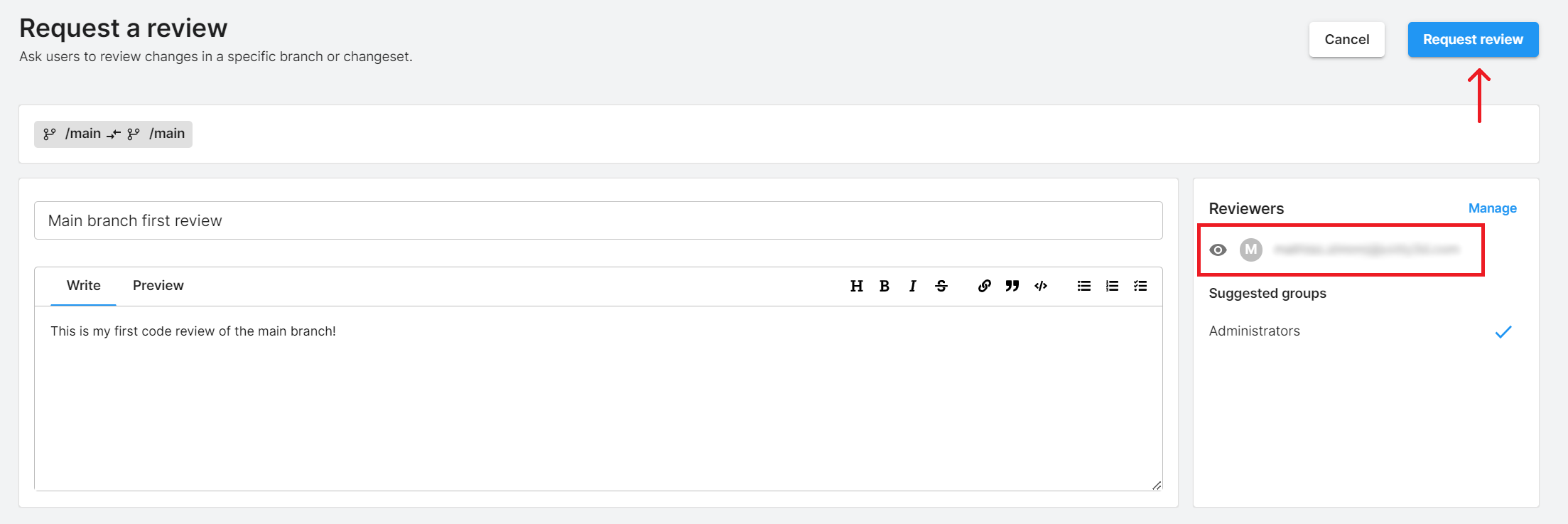 3. Select the Changeset tab, then select the Request a review button associated with your latest changeset.