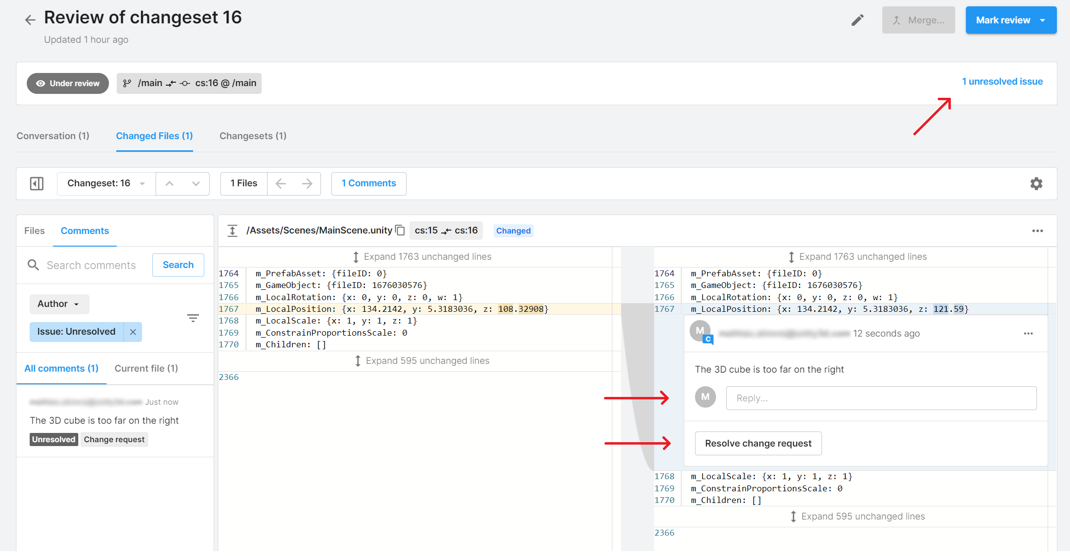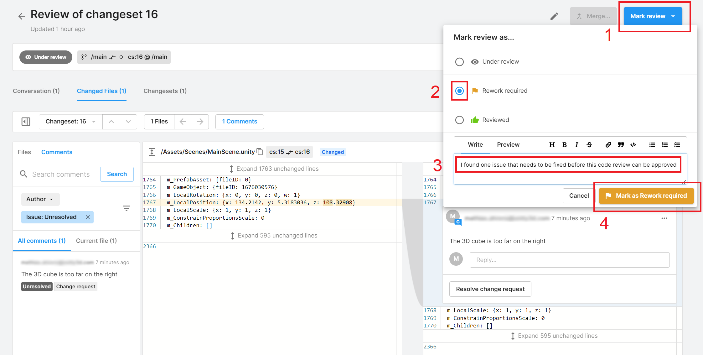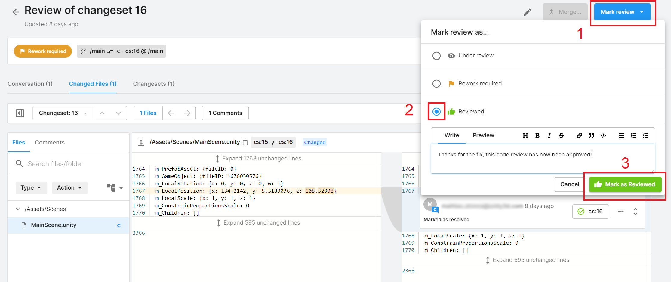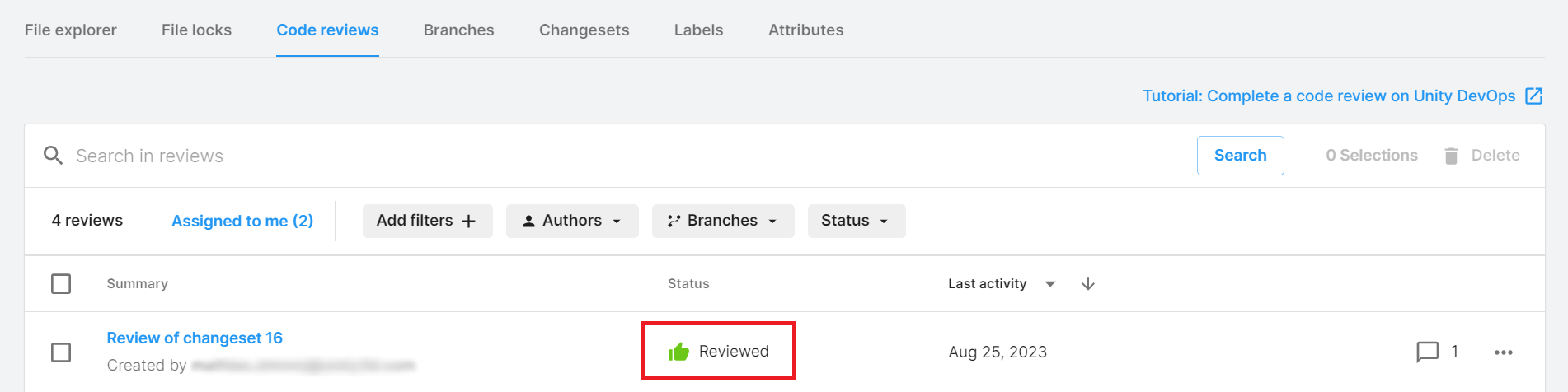 Important: While it’s a useful way to learn how to complete code reviews in Unity Version Control, self approval of code reviews is not best practice. The whole purpose of code reviews is to have someone other than the author check over code for any mistakes!