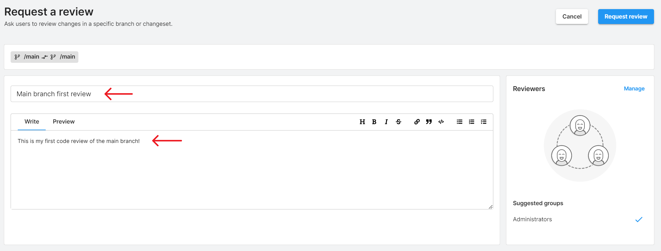 6. Enter “Main branch first review” in the title box and “This is my first code review of the main branch!” in the Leave a description box.