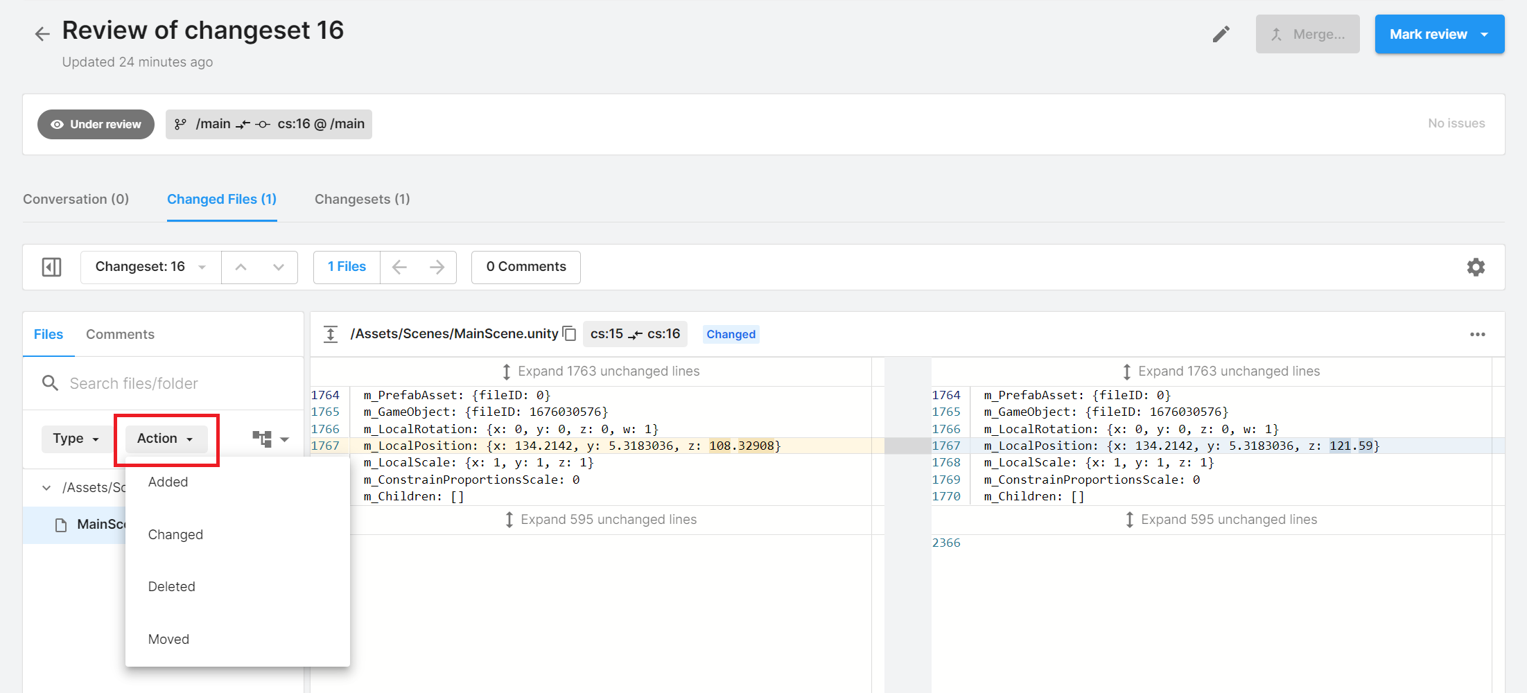 In our example, we only have one file, the MainScene.Unity, which was changed. However, when you start dealing with multiple changed files, this filtering option can be very useful.