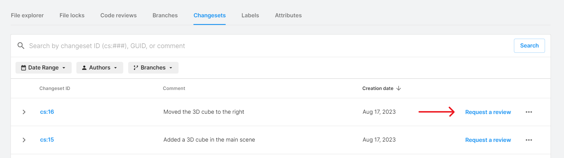 Note: You can also request a code review from the Changeset tab. Using the Branch tab is useful when you want to request a review of larger updates to your project. The Changeset tab provides a more detailed look at changesets, which occur much more frequently in projects.