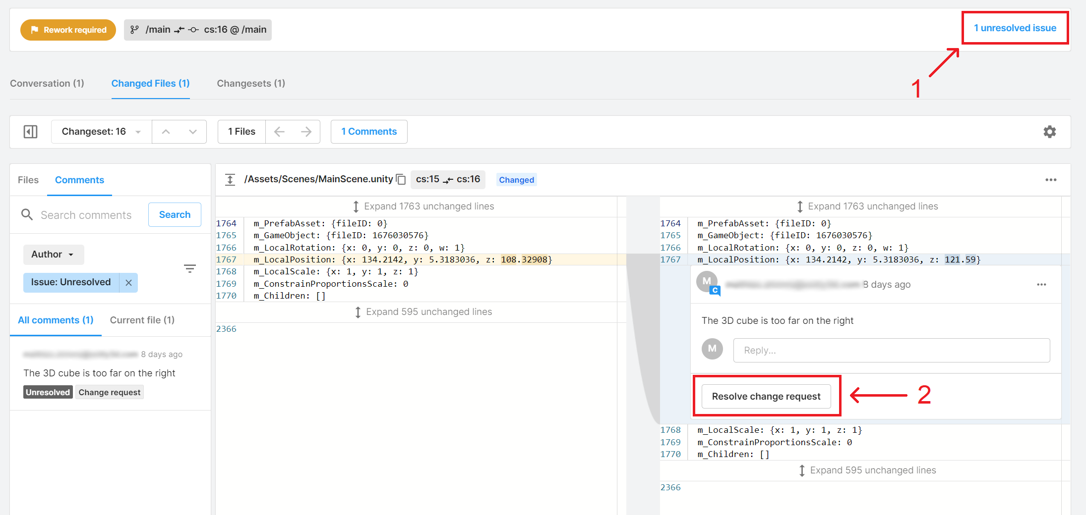 In the navigation bar, you can see the number of files available for review. Since you only added and moved a single 3D cube in your scene, this code review should only have one file to review. But keep in mind that when you start making bigger changes, you might have to review more than one file in your future code reviews.