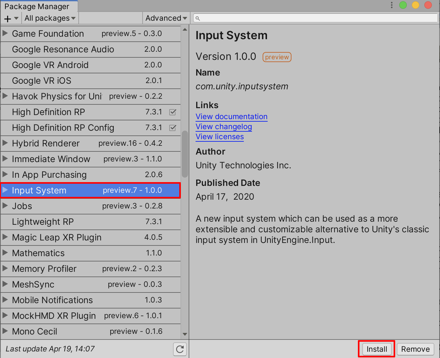 2. In the All Packages column, select Input System, and select Install (Figure 01).
