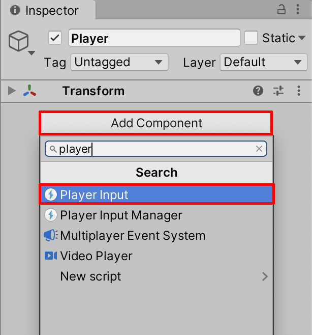 17. We will now set up the Player Input Component to the Player. With the Player GameObject selected in the Hierarchy Window, select Add Component in the Inspector Window, and search for Player Input (Figure 16).