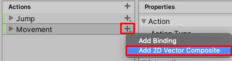 14. Now when you select the + button next to the Movement Action, you can select to add a 2D Vector Composite (Figure 14).