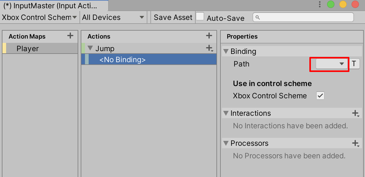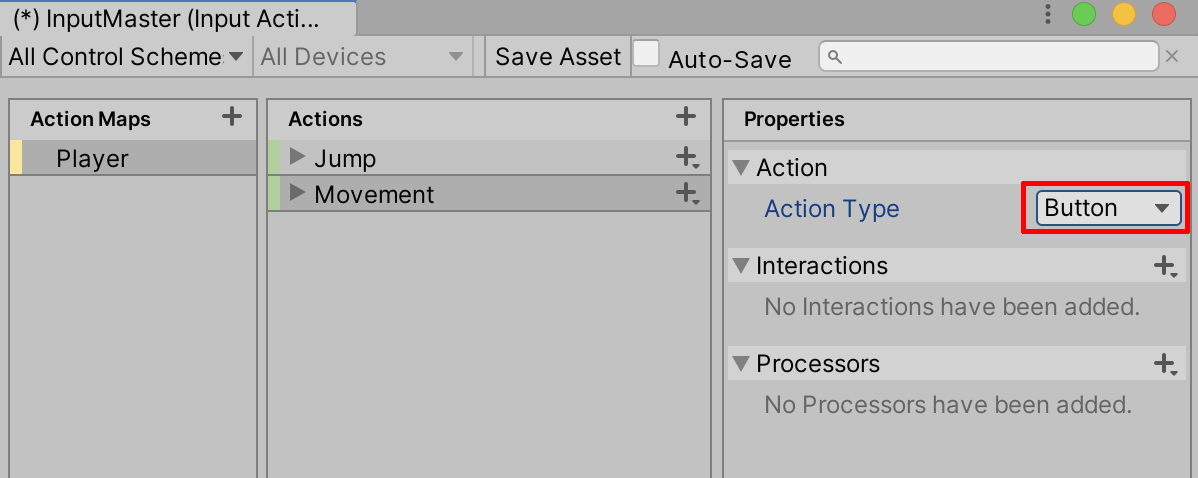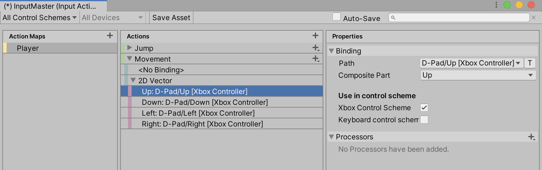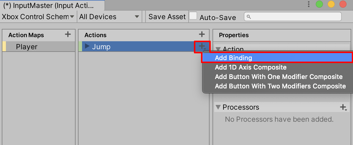 16. Create any additional Input Actions you will need for your Project, exploring through the various features that the Input System offers. When finished, select Save Asset. For the full documentation of the Input System, follow this link.