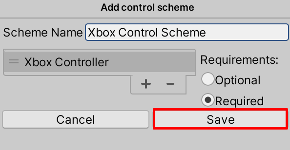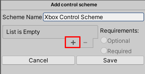 4. In the Add Control Scheme Window, select the + button to create a new Control Scheme, and rename the Scheme Name to “Xbox Control Scheme” (Figure 05). Later, you can always create additional Control Schemes for adding other input sources, such as from the keyboard.