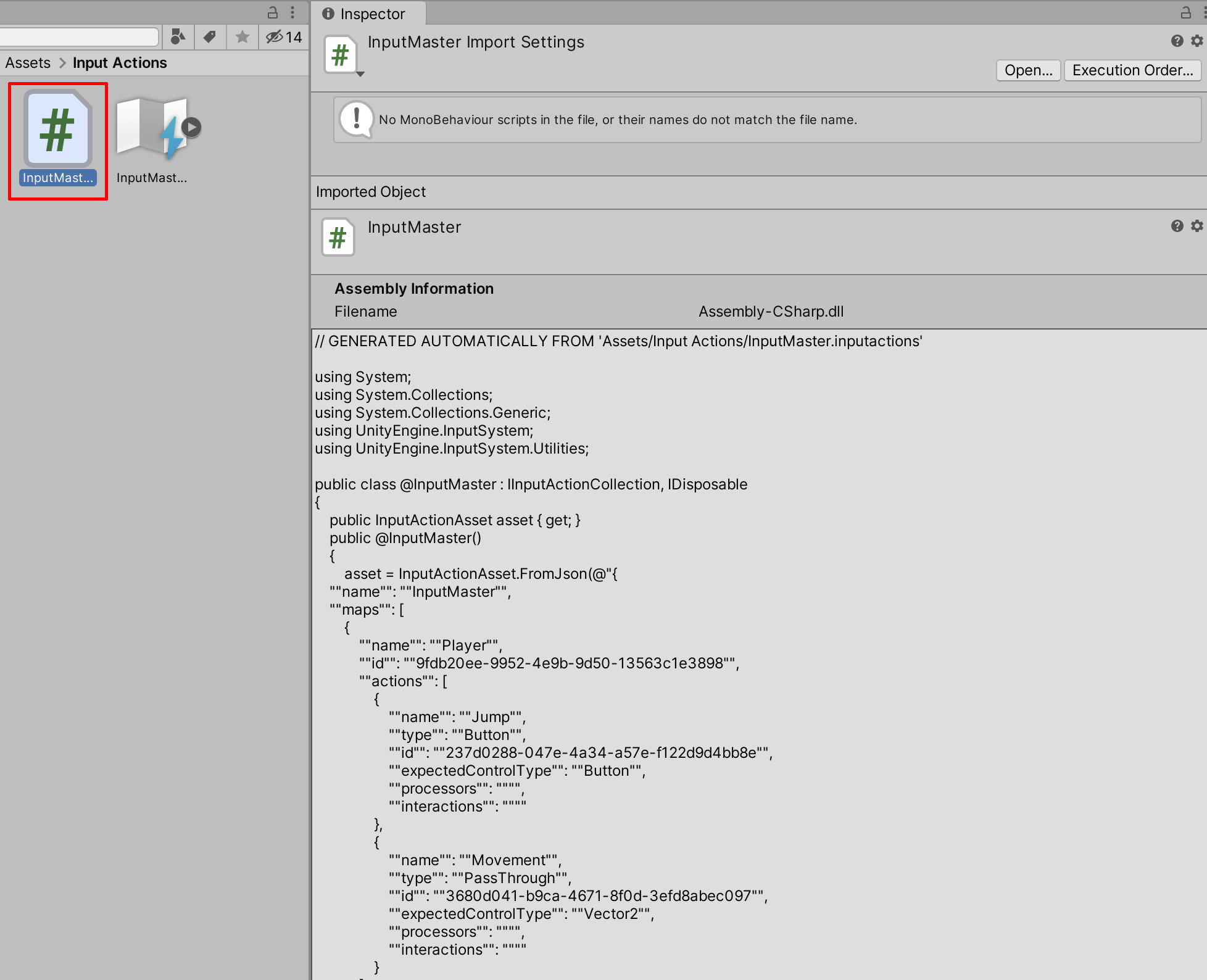 2. Double-click the newly created “InputMaster” in the Project Window, to open up the Input Actions Window.