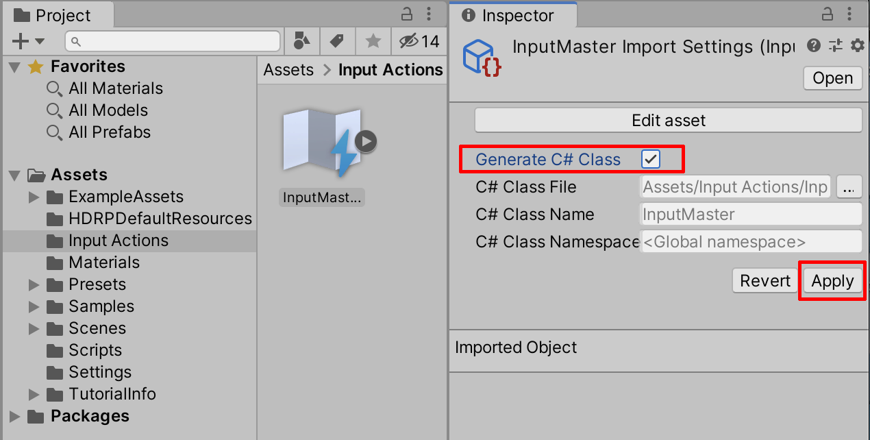 20. Lastly, the Input System will generate the C# Script for your Input Actions for further modification of your Project’s needs. Select “InputMaster” from the Project Window, select the Generate C# Class checkbox in the Inspector Window, and select Apply (Figure 19).