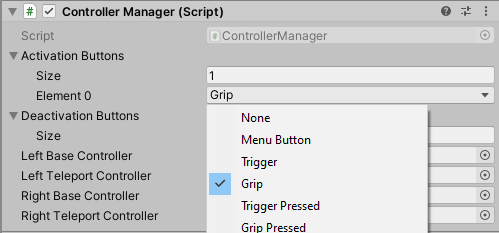 The Controller Manager is included with the XR Interaction Toolkit Examples. It allows the developer to choose which buttons on a controller activate and deactivate the option to teleport within the Scene. It also allows the user to specify GameObjects to represent the left and right hands in normal interaction and while teleporting.