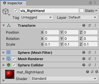 7. Repeat steps 5 and 6 for the LeftHand Controller. You may wish to assign each Sphere a unique Material and/or a different 3D primitive to distinguish them.