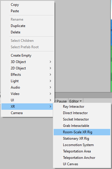 1. In the Hierarchy view, right-click and select XR > Room-Scale XR Rig (Figure 02) or Stationary.