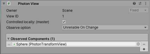 13. In the Photon View section of the Sphere’s Inspector, enable Controlled locally (Figure 04). This will make the Unity Editor instance the master, and cause the Build to sync to it.