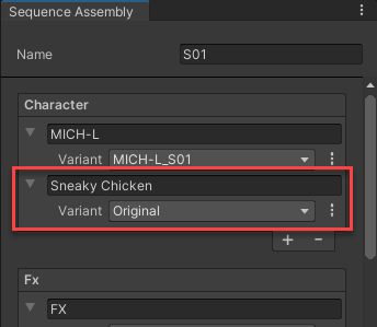 2. In the Sequence Assembly window now showing the Sequence Assets of S01, in the Character section, select Add (+).