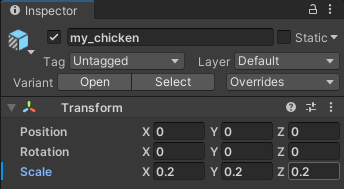 3. Set the Scale of the instantiated asset to 0.2 in all directions.
