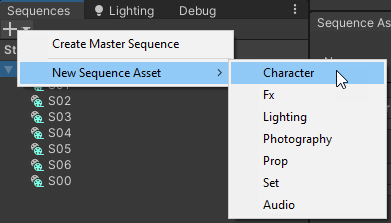 1. In the Sequences window, select Add (+) and then select New Sequence Asset > Character.
