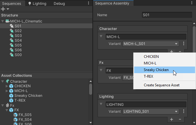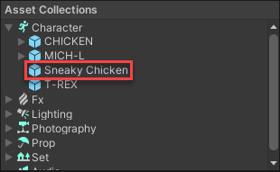 1. From the Sequences window, open the Sequence Asset in Prefab edit mode: under Asset Collections, double-click on the “Sneaky Chicken” Sequence Asset.