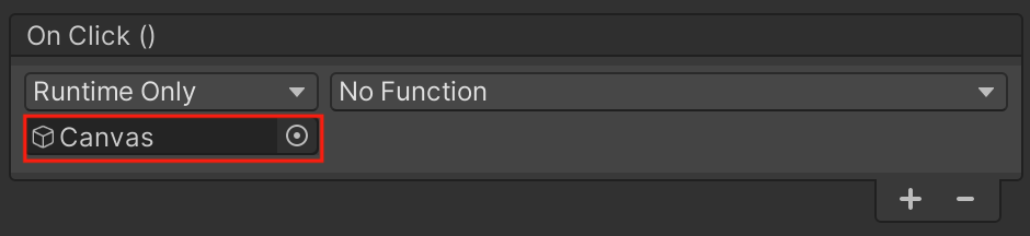 4. Drag and drop the Canvas GameObject to the target field of the On Click event, underneath the Runtime Only drop-down, to assign it.