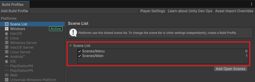 2. In Unity Editor’s top menu, go to File > Build Profiles. A new window will appear, in the Platforms section select Scene List. This is where a scene’s index is set.