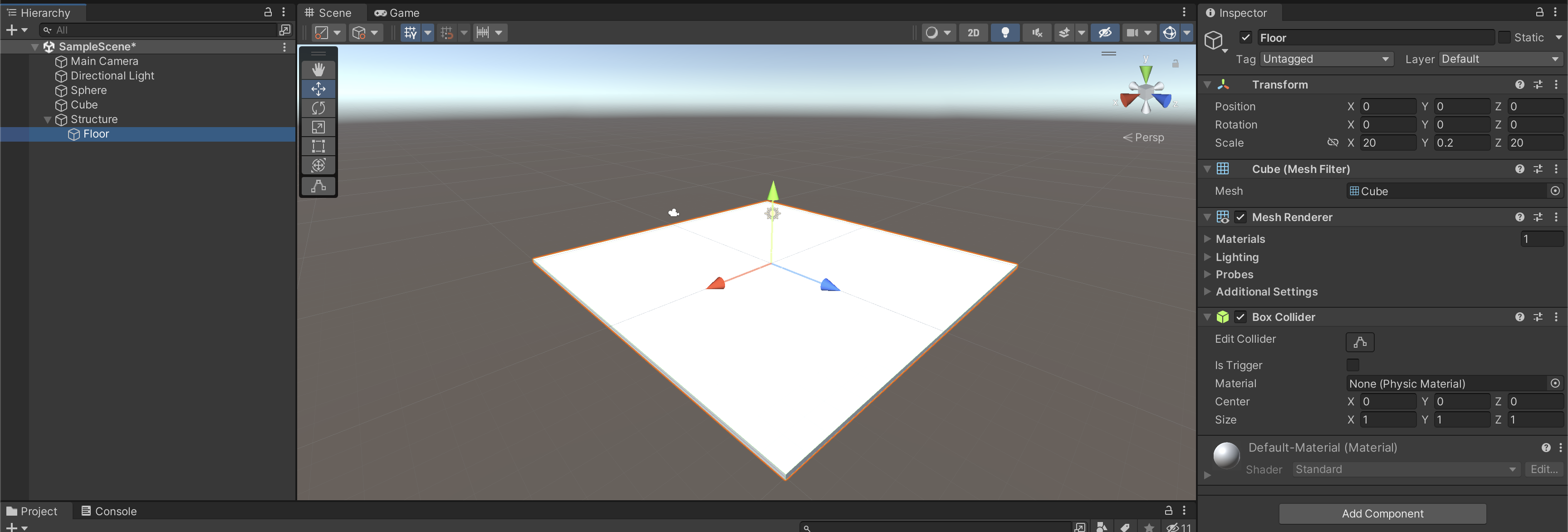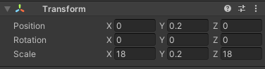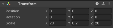3. In the Inspector, locate the Transform component and the Scale coordinates for the Floor GameObject. Change the Scale to 20, 0.2, 20 to create a floor for your structure.