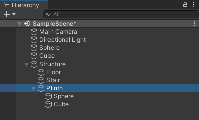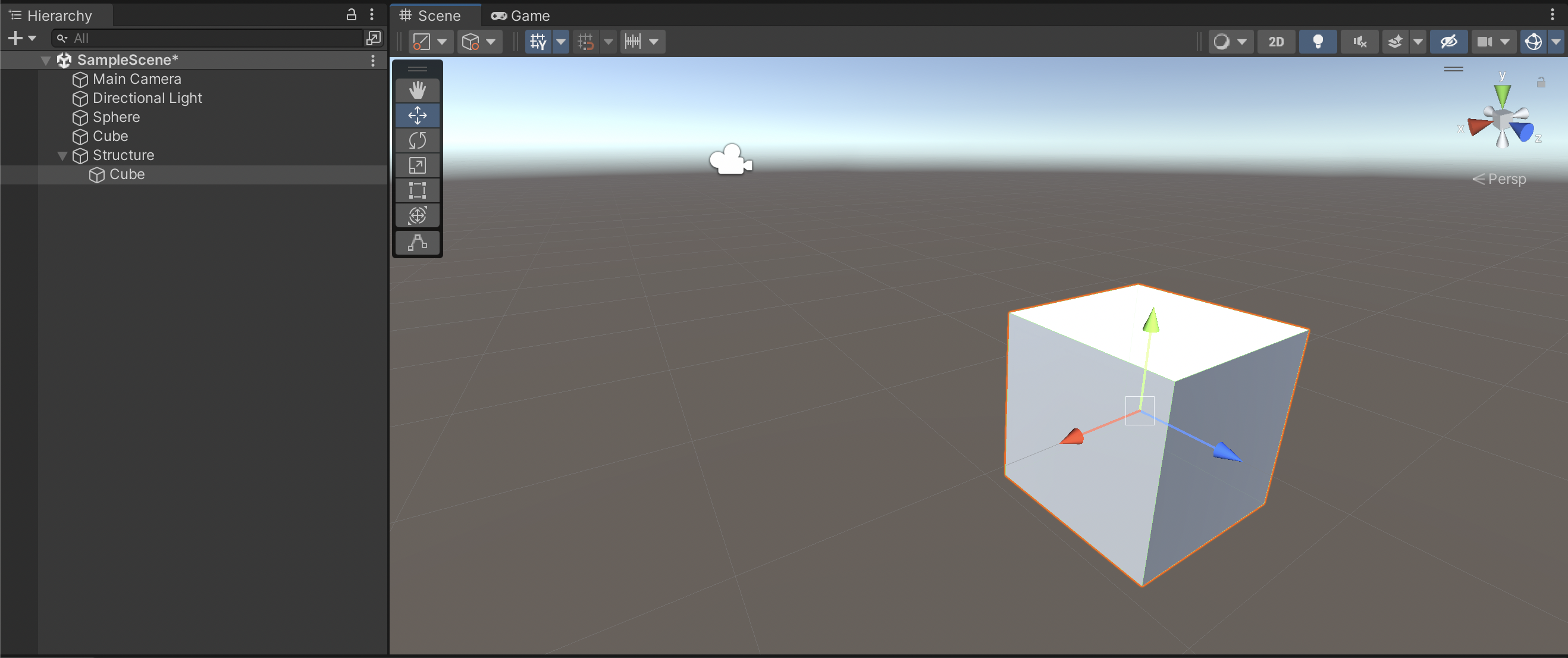 1. In the Hierarchy, right-click the Structure GameObject and select 3D Object > Cube to create a new cube primitive as a child of the empty GameObject.
