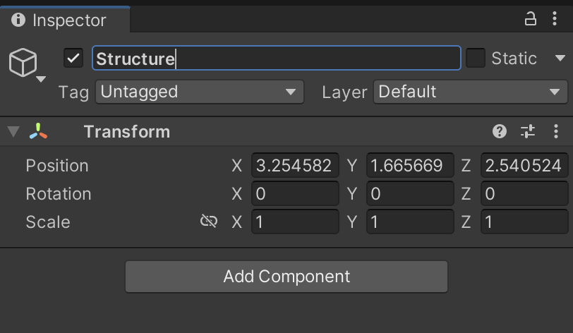 2. Rename this GameObject to “Structure” in the Inspector. Its name will also change in the Hierarchy. (You can rename objects from the Hierarchy as well)