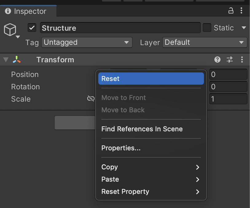 3. If the position of your empty GameObject isn’t 0, 0, 0, as in the example above, you can reset it to the center of the scene in one easy step: in the Inspector, select More (⋮) to the right of the Transform component header and then select Reset Position.