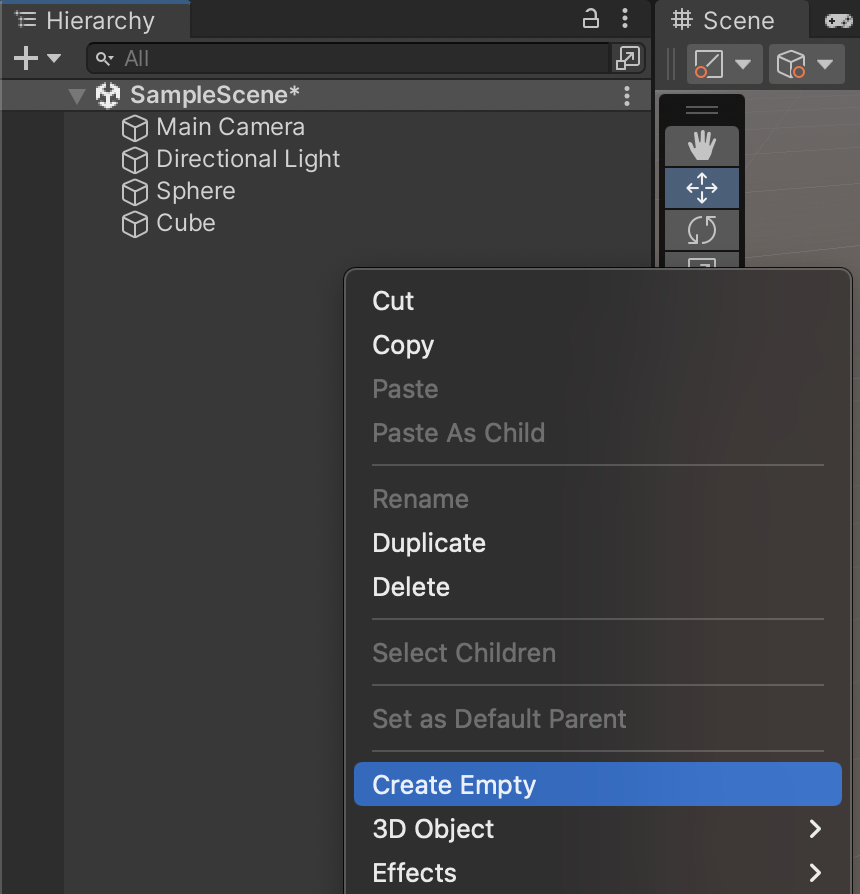 2. In the Hierarchy, select the empty GameObject, then right-click and select 3D Object > Cube to add a cube primitive as the child of the empty GameObject.