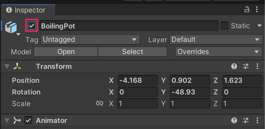 2. In the Inspector window, select the checkbox to the left of the BoilingPot’s Name field to enable the GameObject in your Scene.