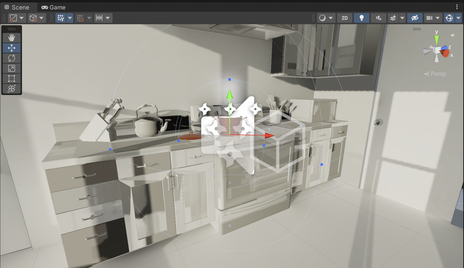 8. Enter Play Mode and move the Character around, nearer to and farther from the kitchen stove. The volume of the BoilingPot’s audio now increases the closer you are to the BoilingPot GameObject.