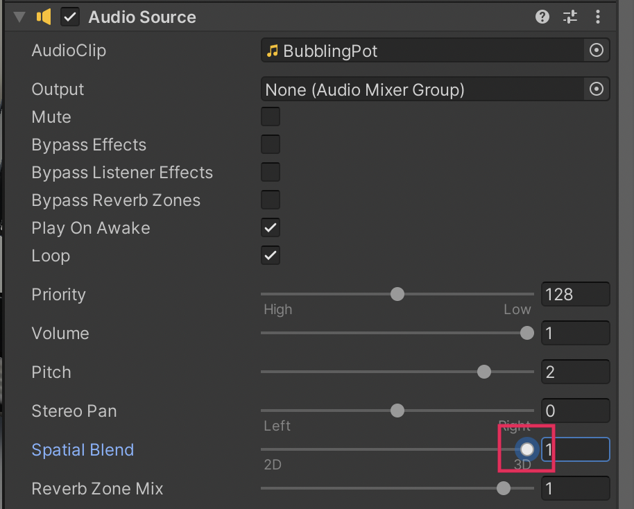 7. To convert this Audio Source to 3D sound, select and drag the Spatial Blend slider all the way to the right, or set its value to 1.