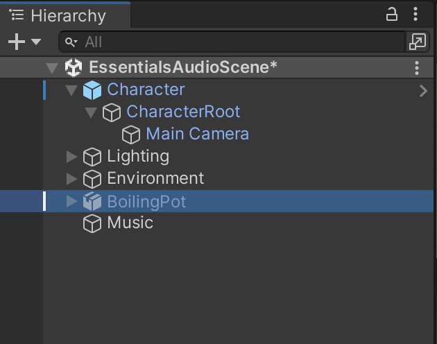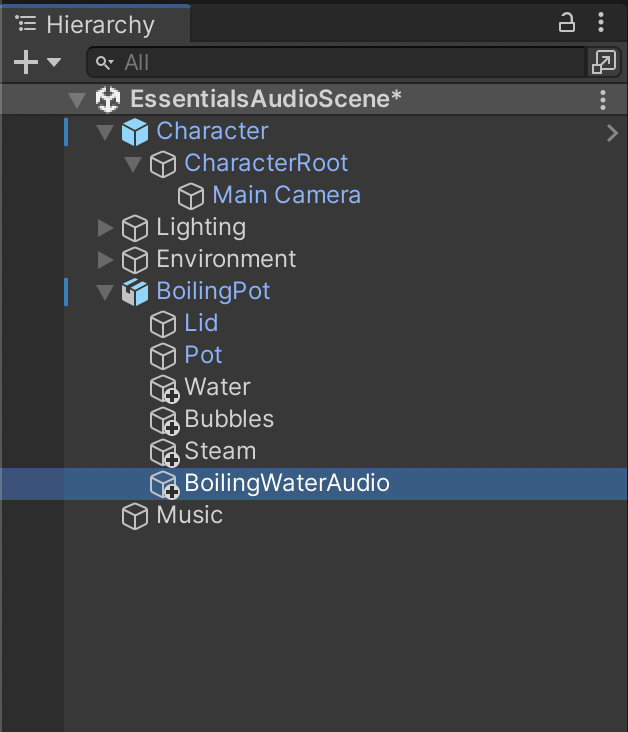 5. Select the BoilingWaterAudio GameObject that is a child of BoilingPot.