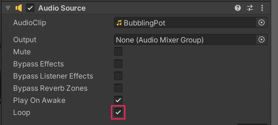 6. In the Inspector window, take a look at the Audio Source Component’s properties. For this Audio Source, we have enabled the Loop setting to provide the continuous boiling sound.