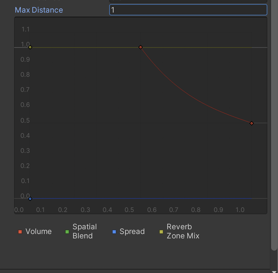 2. Set the Min Distance to 0.5 and the Max Distance to 1. Within the Min Distance, the Audio Source will play the clip at the maximum volume. Outside of this distance, the volume will reduce up to the Max Distance, where the user will no longer hear the audio.