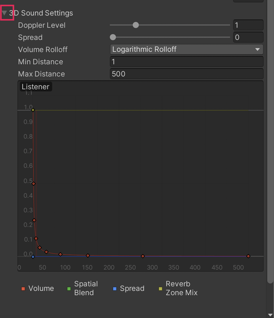 1. With the AudioSource GameObject selected, select the arrow to the left of 3D Sound Settings to expand the properties in the Inspector.