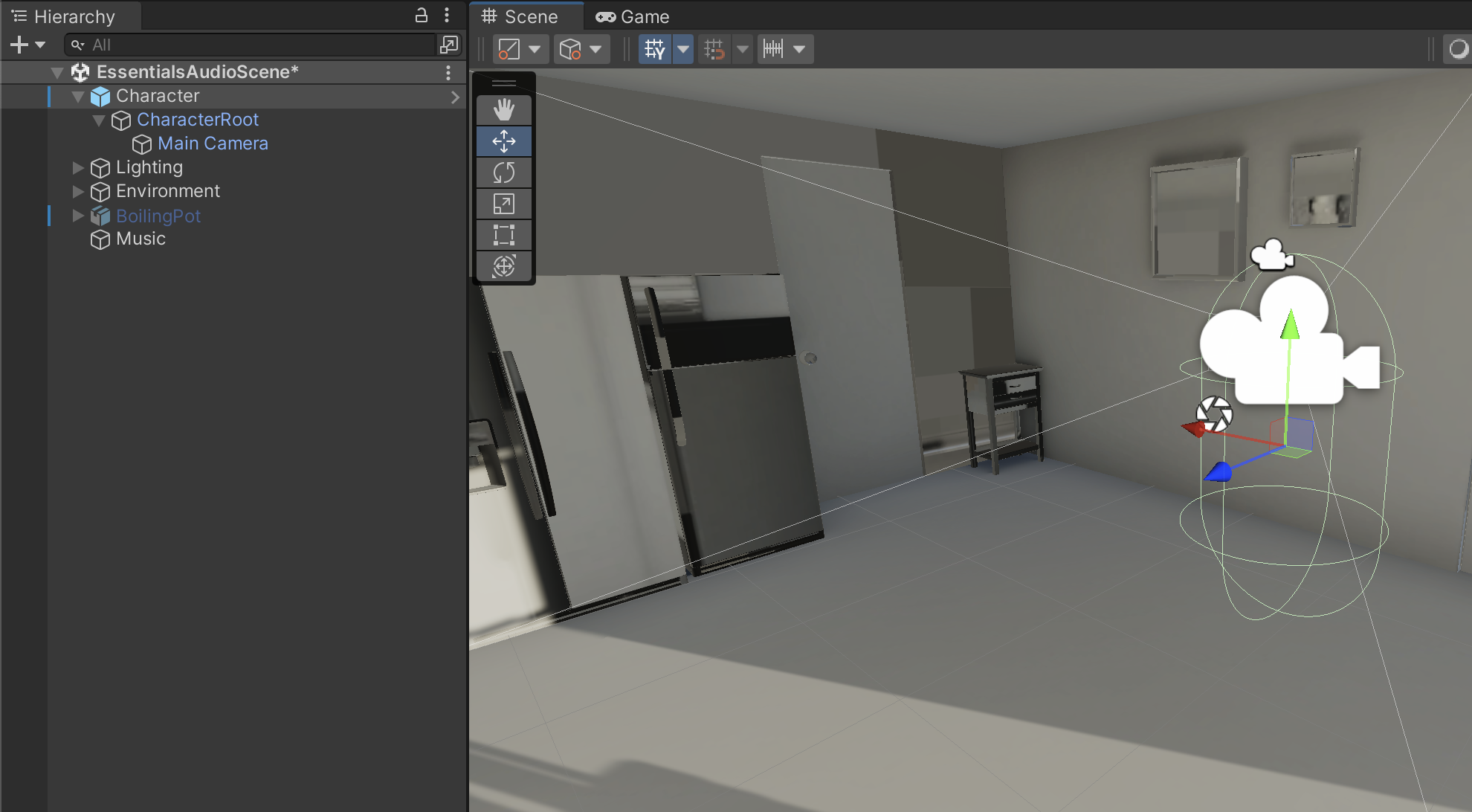 In this Scene, we have prepared a GameObject called Character to represent the user moving through the kitchen. The Character GameObject consists of the Main Camera (eyes) with its built-in Audio Listener (ears) and a capsule Collider (body; like a capsule primitive, but invisible — and as a Collider, it bumps into other GameObjects instead of going through them).