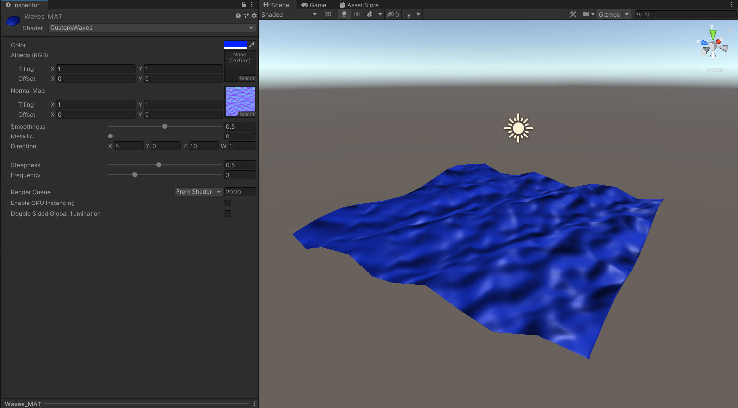 This serves as an introduction to displacing a mesh’s vertices via shaders. In essence, Gerstner waves are modified trigonometric waves that produce sharper peaks. We have learned how to modify this wave with a customizable amplitude, frequency, and wave direction. With this knowledge, we can now extend our wave shader to include multiple waves with varying frequencies and amplitudes. This will lend itself to a greater sense of realism without extensive modifications to the shader or runtime performance.