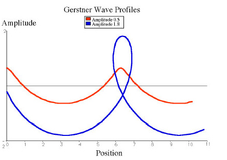 The figure below demonstrates the effect that high amplitudes have on the shape of Gerstner waves (Figure 13).