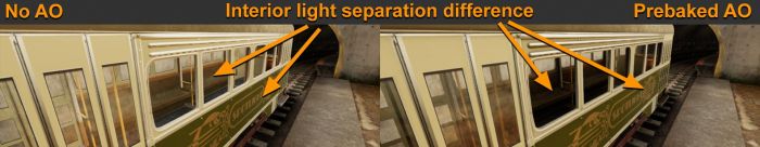 On the example above the tram on the left without AO applied Light Probe lighting data without knowing how to differentiate the interior and the exterior surfaces. With the prebaked AO, this map serves as a guide to reduce the intensity of light and reflection from the exterior, giving a much more grounded look.