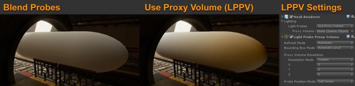 - Light Probe Proxy Volume (LPPV). Surfaces of dynamic objects that aren’t lit by dynamic lighting typically use Light Probe data to fill in their lighting information (In a Scene where probe is not present Environment Lighting is used). Depending on lighting strategy used in the setup of the Scene, this can range from indirect lighting information down to shadowing and baked diffused probe lighting information. This Light Probe strategy usually works fine for small dynamic objects, however larger objects require a finer granularity of Light Probe lighting. This is where Light Probe Proxy Volumes comes in. Check Unity manual for LPPV guide. Using Light Probe Proxy Volumes allow a large dynamically lit object to use more than a single Light Probe resulting in higher lighting accuracy.