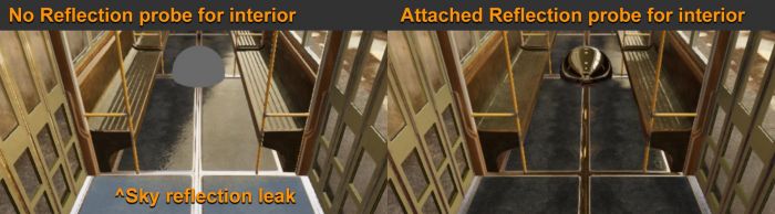 The Tram and the background door are grounded better, but reflections look out of place. Sky reflection is all over the place and shows up inside the tunnel. This is where reflection probes comes in. Efficiently place reflection probes with proper coverage in the Scene as needed (In the Scene above 1 reflection probe for the entire room is sufficient). 128 pixels Cubemap Resolution using box projection usually is a good baseline for typical cases and will keep memory and reflection bake times happy.