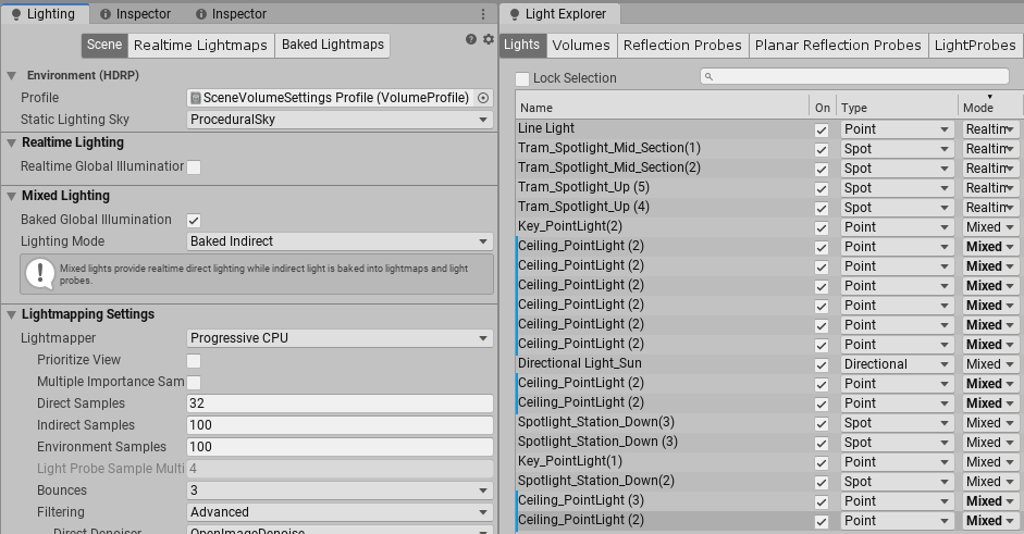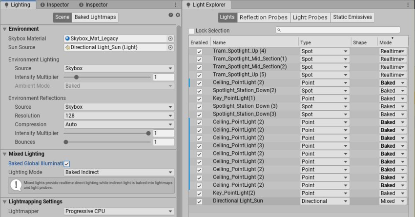 - The Main Directional Light (sun) has its Mode set to Mixed to cast real-time shadows while still producing bounce lighting.