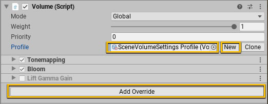 2. Configure the Volume Profile by adding overrides for the desired post-processing effects.