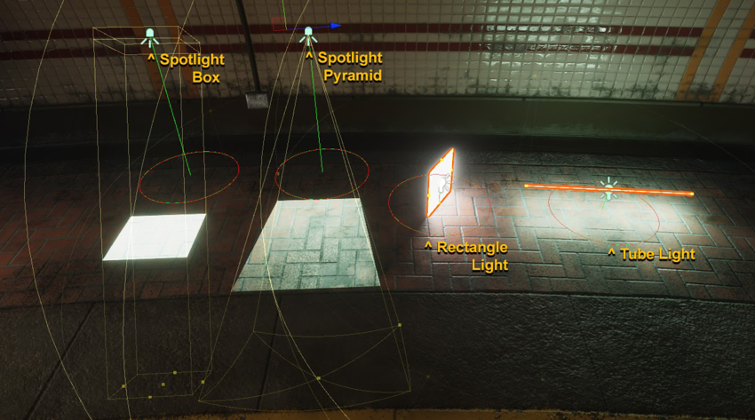 - HDRP supports additional Light types, such as Spotlight Pyramid/Box, Realtime Tube, and Realtime Rectangular lights. These can help you achieve different realistic effects.
