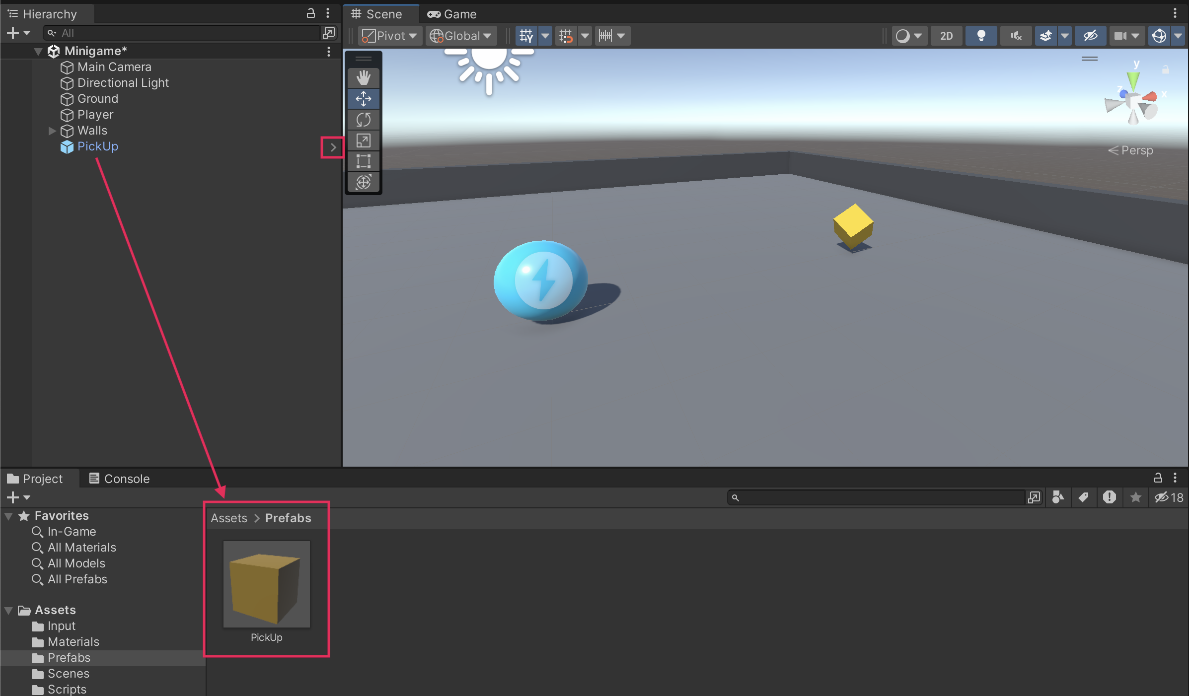 - Drag the PickUp GameObject from the Hierarchy window into the Prefabs folder.