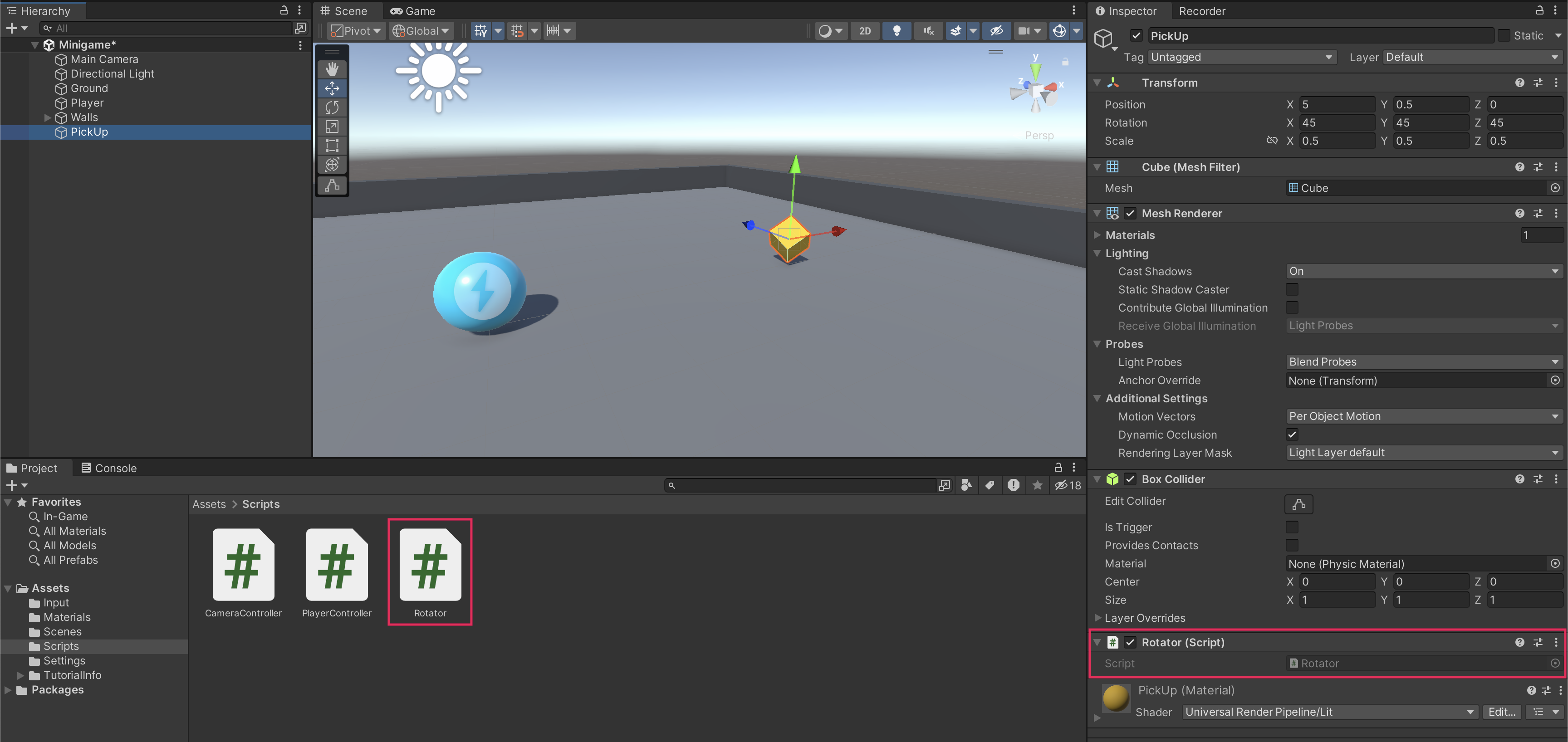 Follow the video or text instructions below to create a new Rotator script and rotate the PickUp GameObject in the Update function: